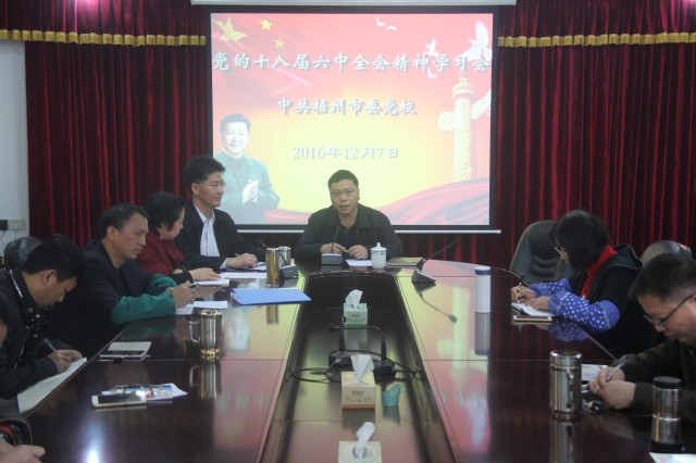 市委党校学习贯彻党的十八届六中全会精神12月7日,市委党校召开中心组扩大学习会,专题学习党的十八届六中全会精神。会上,党史党建教研室副主任、副教授田新元以《党的十八届六中全会精神解读 》为题作了专题辅导。副校长、党总支部书记莫汝杰、干部职工代表梁萍、宋秀波作了…