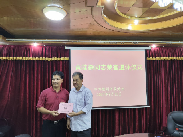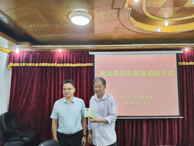 根据《梧州市干部荣誉退休制度》文件有关精神,7月11日,我校举办了一场简短而温馨的荣休仪式,欢送黄陆森同志光荣退休。学校分管组织人事、培训科的校领导、各科室负责人、培训科全体成员参加仪式。副校长莫汝杰主持仪式并做讲话。