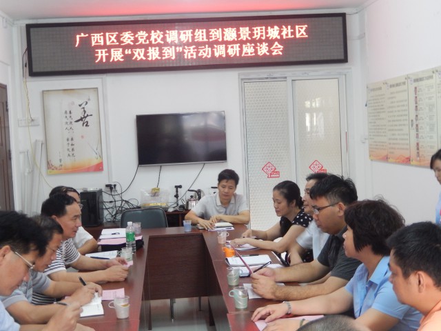 9月27-28日,自治区党校机关党委专职副书记陈庆田一行4人到我市,调研学习我市在职党员到社区“双报到”情况。调研组一行先后到我市万秀区宝石社区、长洲区灏景玥城社区调研考察,现场观看两个社区“双报到”活动成果和建设智慧社区的成果、与两个社区大党委成员和“双报到”单位分管工作领导座谈,详细了解我市社区“双报到”活动的经验做法。调研组一行非常感谢两个社区介绍的宝贵经验,对两个社区“双报到”活动以来取得的成果,特别是以“双报到”活动推动智慧社区建设的成果表示赞赏。