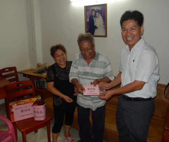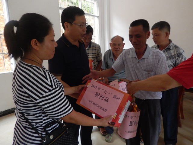 6月27日,由郭坚常务副校长领队,到本校扶贫联系村——苍梧县六堡镇高枧村慰问困难党员3人。28日由莫汝杰副校长领队,慰问了本校“双报到”社区——梧州市宝石社区困难党员2人和本校老党员、老党务工作者等6人。两位校领导向慰问对象赠送了花生油、饼面等慰问品和慰问金,为他们送去党的关怀和温暖,鼓励他们要增强战胜困难的勇气和信心。