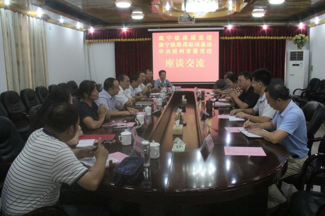 在12日下午召开的座谈交流会上,南宁铁路局党校常务副校长刘均福、南宁铁路局职工培训基地书记冯志文、主任曹珍文,以及我校常务副校长郭坚分别介绍了本单位有关情况。双方就如何搞好教学科研、资政服务、师资队伍、后勤建设、党建工作等内容进行了探讨。双方互相借鉴学习,并表示今后将进一步加强联系,共同致力于党校事业发展,以便更好地发挥党校在服务地方经济社会发展中的作用。当日下午,双方各业务科室也分别开展了对口业务工作交流。