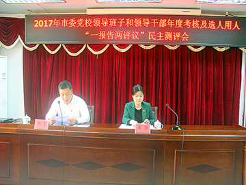 3月19日下午,根据市委组织部的要求,我校召开了2017年度领导班子和处级干部年度考核暨选人用人工作“一报告两评议”会议。市考核组吴静同志代表考核组就本次考核的对象范围、考核内容、考核流程、考核要求等作动员讲话;郭坚常务副校长代表校委班子作2017年度党校工作及选人用人工作汇报;考核组以民主评议、民主测评、约谈领导、查阅台账等方式,对我校领导班子、班子成员及选人用人工作进行了年度考核。