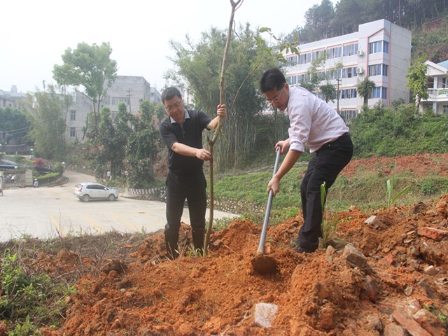 郭坚常务副校长(左)与莫汝杰副校长(右)正在协作植树