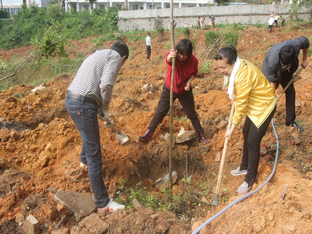 3月30日上午,学校在职党员和全体职工齐聚市委党校学员宿舍楼前的山坡上,开展植树绿化活动。大家纷纷肩挑或抬树苗到植树点,然后拿起铁锹、锄头来到树苗前,自动结成劳动小组,相互配合着扶正树苗、回填泥土,劳动场面热火朝天。经过一上午的繁忙劳动,就种植上一百多株新树,为校园再添新绿。