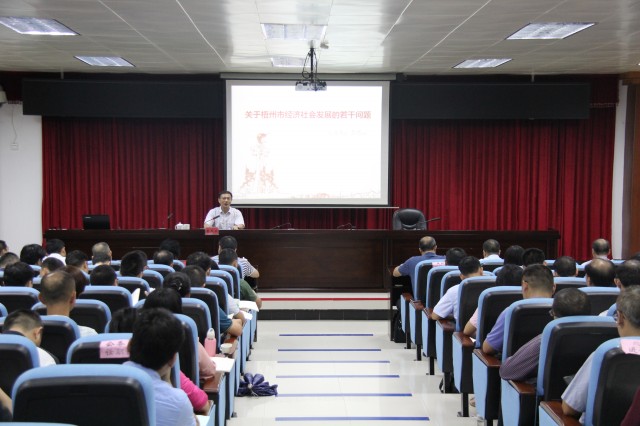 9月17日上午,市长李杰云应邀到我校(院)为秋季学期主体班学员作《关于梧州市经济社会发展的若干问题》专题报告。李杰云站在全市经济社会发展全局的高度,以宏观的视野和战略的眼光,立足实际、旁征博引,客观分析了梧州市经济社会发展的优势与短板,系统阐述了进一步解放思想、全面深化改革、推动振兴工业、实施“东融”战略、加强政策研究、改进工作作风等六个方面问题,并提出战略思路与工作举措。