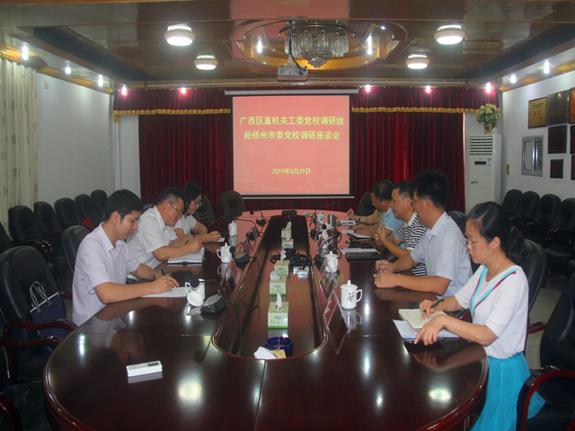 8月29日,自治区直属机关工委党校常务副校长赵修安一行三人来到梧州市委党校,就教学培训、科研咨询、机构改革、绩效管理、机关党建等工作,与我校相关领导和科室负责人进行座谈交流,我校常务副校长郭坚向赵修安一行介绍了我校有关情况。双方就共同关心关注的问题进行了深入探讨交流。