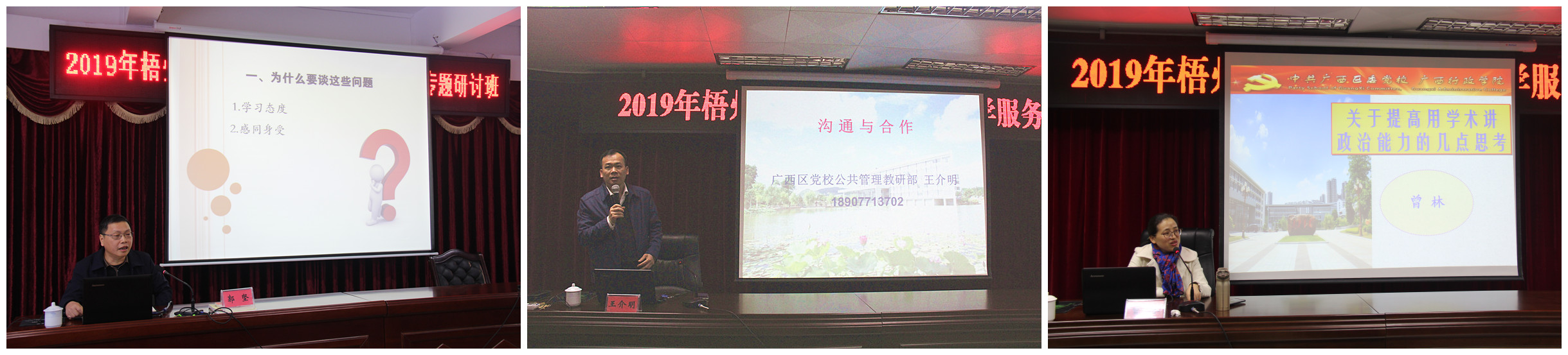 上图分别为梧州市委党校常务副校长郭坚、广西区委党校副教授王介明、广西区委党校教授曾琳授课