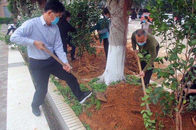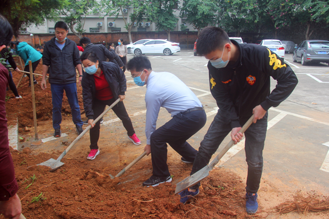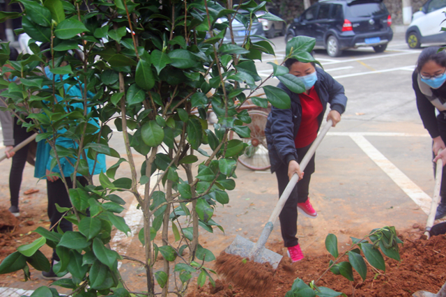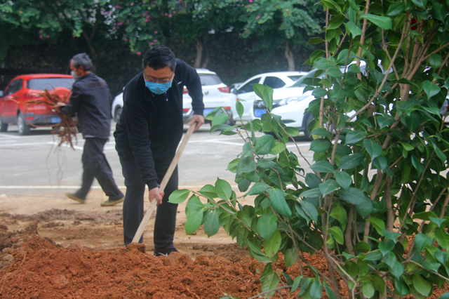 阳春三月间,草长莺飞际,为积极响应国家大力开展植树造林的号召,3月12日上午,郭坚常务副校长带领我校全体干部职工开展植树活动。经过大家的努力,成功移植30株茶花到办公楼和停车场周边绿化带上。