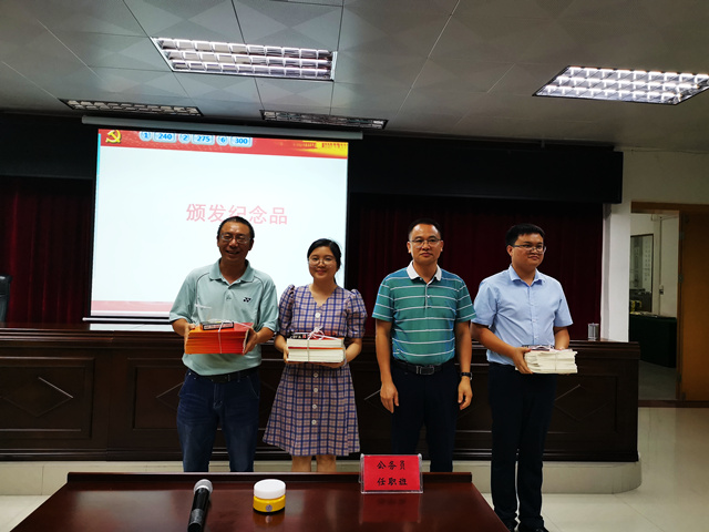 知识竞赛分为必答题、抢答提速、风险反转、终极PK四个环节进行。知识竞赛在题型选择上进行了精心的设计,除单选题外,加入了听红色歌曲接歌词和看红色电影片段猜片名等题型,集政治性、知识性、趣味性相于一体,引起了参赛选手及现场观众的强烈反响。整场比赛气氛热烈,高潮迭起。选手们凭借丰富的知识积累和迅速的临场反应,赢得了现场观众的阵阵掌声。经过精彩角逐,最终我校教职工代表队获得团队一等奖。竞赛环节结束后,全体人员起立齐唱《没有共产党就没有新中国》将活动推向高潮,活动取得圆满成功。