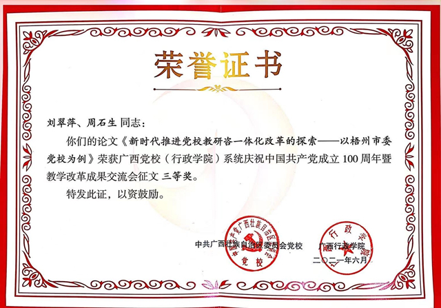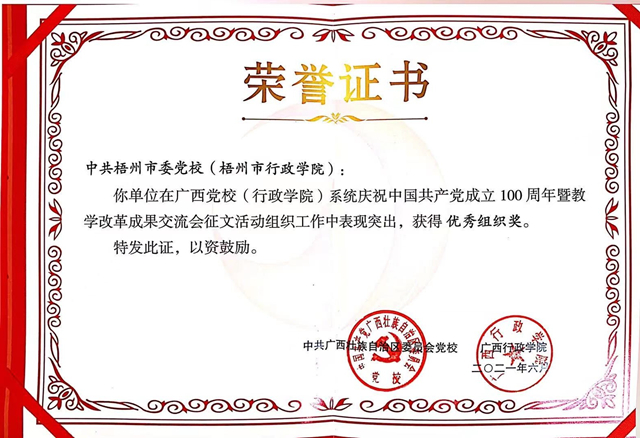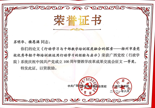 2021年6月26日,广西党校(行政学院)系统庆祝中国共产党成立100周年暨教学改革成果交流会在钦州市委党校召开。本次研讨交流会会共收到各单位推荐报送论文59篇,共评选出优秀论文一等奖5篇,二等奖5篇,三等奖10篇。我校获得广西党校(行政学院)系统关于庆祝中国共产党成立100周年暨教学改革成果交流会优秀组织奖。我校苏明华、楼恩满老师合作撰写的《行动学习与干部教学培训深度融合的探索——梧州市委党校优秀年轻干部培训班运用行动学习的经验与启示》荣获本次交流会一等奖;刘翠萍、周石生老师合作撰写的《新时代推进党校教研咨一体化改革的探索——以梧州市委党校为例》获本次交流会三等奖。(教学研究室撰稿)