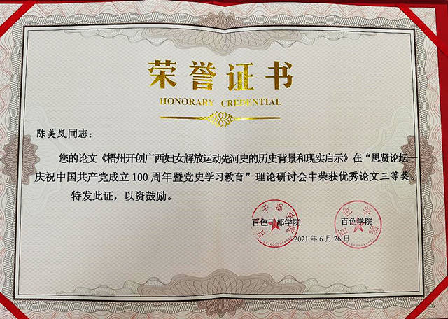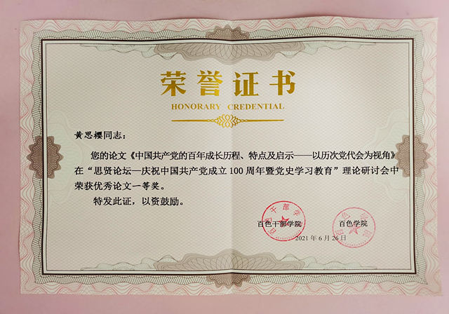 2021年6月26日,由百色干部学院和百色学院联合举办的“思贤论坛——庆祝中国共产党成立100周年暨党史学习教育”理论研讨会在百色干部学院隆重举行,我校教师黄思樱的《中国共产党的百年成长历程、特点及启示——以历次党代会为视角》和梁萍的《中共梧州早期党组织建立发展的历史作用及经验启示》获本次征文一等奖,陈美岚的《梧州开创广西妇女解放运动先河史的历史背景和现实启示》获三等奖。黄思樱作为获奖作者在研讨会上发文。